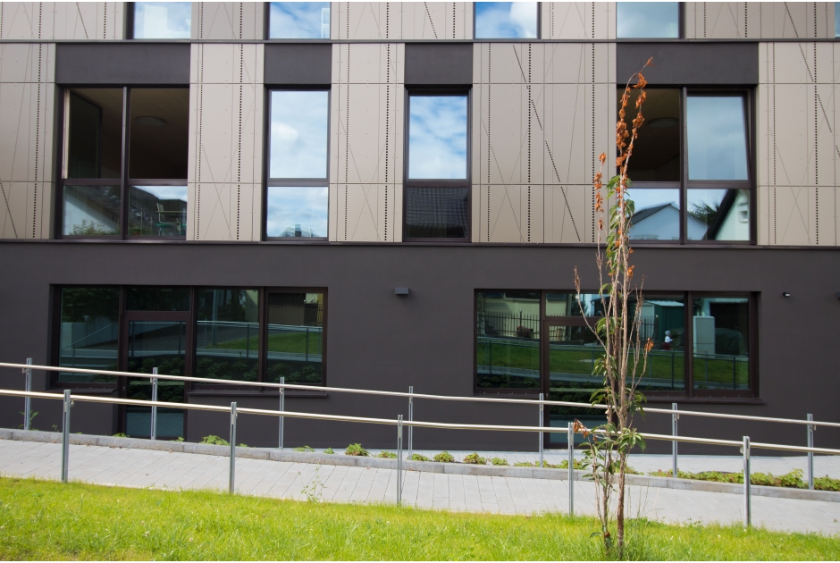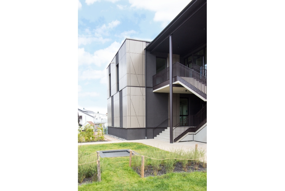 Die horizontal gegliederte Lochfassade schafft mit zwei unterschiedlich farbigen Aluminiumfassadentafeln und ruhigen Putzflächen Bezug zur umliegenden kleinteiligeren Bebauung. Durchgängig über die Tafeln verlaufende perforierte Lochbänderungen fügen die Fassade wie mit einem Band zu einem Ganzen zusammen.