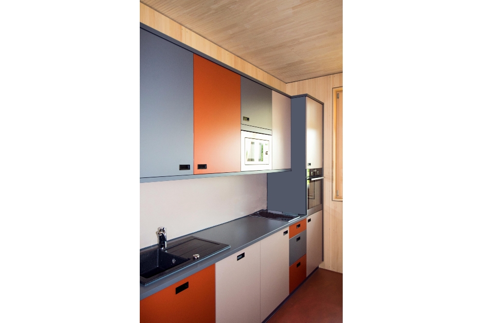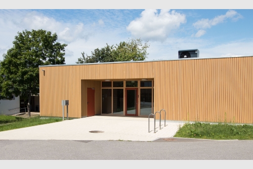Um die Bauzeit möglichst kurz zu halten, sollte der Baukörper in Holz-Modulbauweise umgesetzt werden. Die Gebäudeteile konnten hierbei als Module in den Hallen des ausführenden Holzbaubetriebes vorgefertigt und auf Baustelle nur noch zusammengefügt werden. Durch die Gründung mit im Raster angeordneten Einzelfundamenten anstelle einer massiven Plattengründung, wurde zudem Zeit und Kosten eingespart.