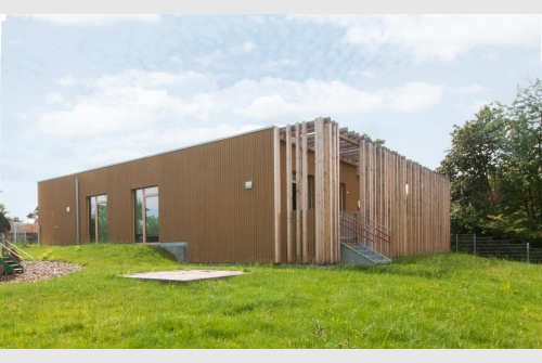 In nur 4 1/2 Monaten Bauzeit wurde das Holzgebäude errichtet. Das zur Betreuung von Kleinkindern geeignete Solitärgebäude steht am Hang im Außengelände des Kindergarten Horrheim.