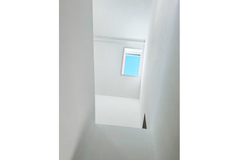 Von der Straße aus wird das Gebäude im Erdgeschoss erschlossen. Die Diele öffnet sich in einen großzügigen offenen Ess- und Küchenbereich mit weitem Blick ins Tal. Über eine in die offene Galerie am Essbereich eingestellte L- förmige Treppe, wird das Wohnzimmer mit direktem Gartenzugang im Untergeschoss erschlossen. Eine gerade einläufige Treppe hinter dem frei in den Essbereich eingestellten Küchenblock führt ins Obergeschoss. Dort öffnet sich der Dachraum bis zu der Dachschräge. Große Dachflächenfenster lassen das Dachgeschoss hell und licht erscheinen. Sie bringen über den offenen Luftraum über dem Küchenblock zusätzliches Licht ins Erdgeschoss. Um den Luftraum ordnen sich im Dachgeschoss zwei Kinderzimmer, das Elternschlafzimmer mit Ankleide und ein Familienbad mit separatem WC an.