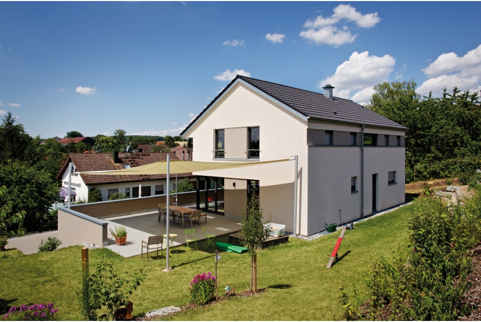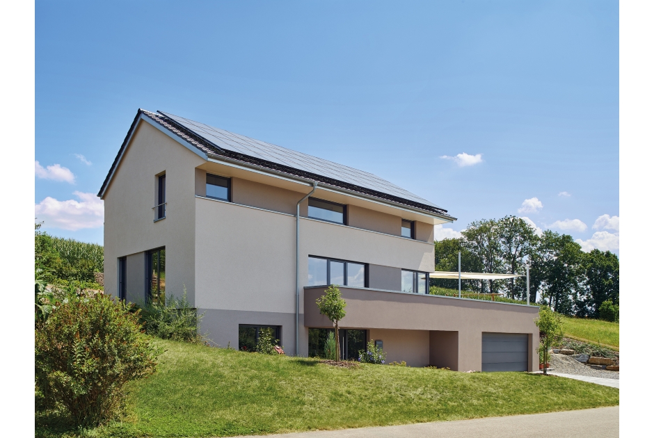 Das darauf asymmetrisch angeordnete Satteldach betont das Thema Ausblick und bietet ausreichenden Sonnenschutz für das südliche Fensterband im Dachgeschoss.