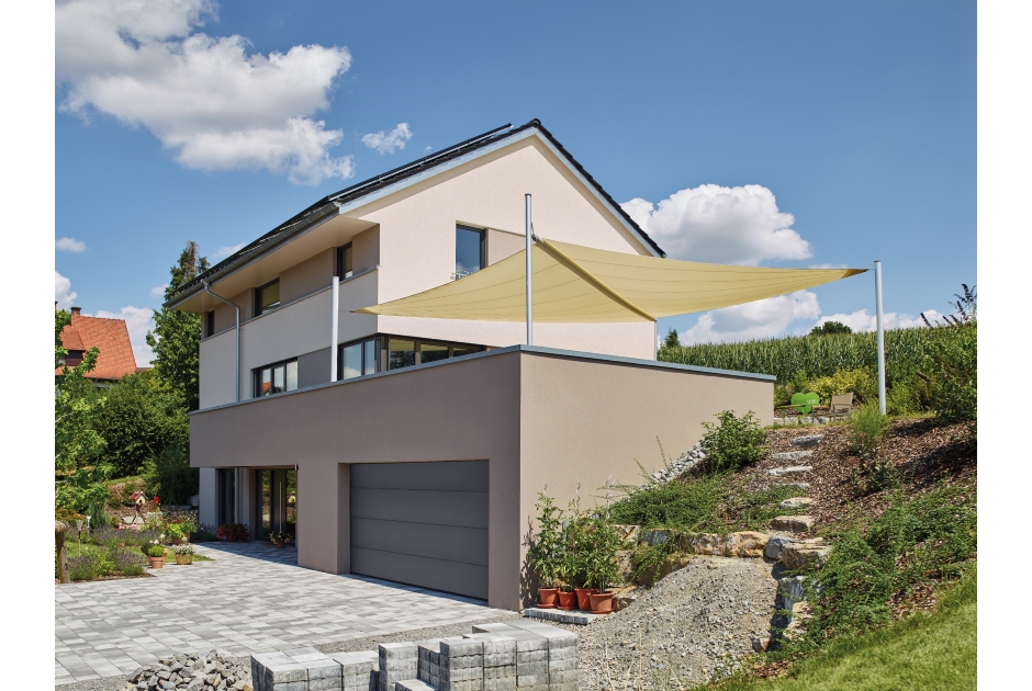 Das über die Gebäudeabmessungen überstehende Untergeschoss markiert von der Straße her den Eingangsbereich und bietet ausreichend Platz für eine vielfältig nutzbare ebenerdige Terrasse im darüber liegenden offenen Wohn-/Essgeschoss.