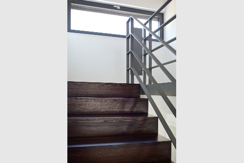 In dörflicher Lage wurde auf einem Hanggrundstück ein Wohnhaus für eine junge Familie geschaffen. Der lang gestreckte rechteckiger Baukörper ist parallel in den Hang eingeschoben.